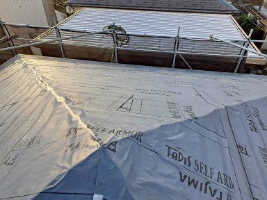 - 屋根重ね葺き工事/モジュール脱着工事/外壁塗装工事/軒天一部貼り増し工事/足場工事